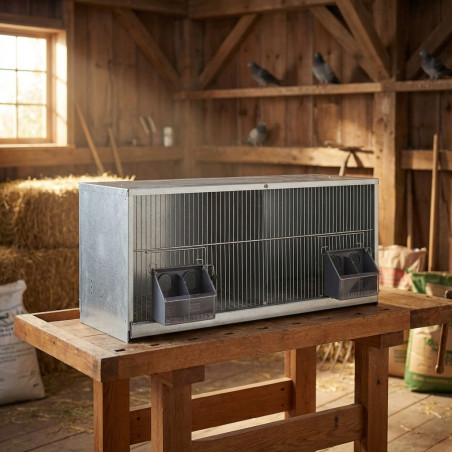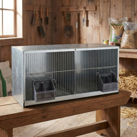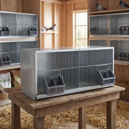 Gaiola para pombos com dois compartimentos. Bandeja removível. Piso em tela para facilitar a limpeza. Divisória articulada com opção de união dos dois compartimentos. Fabricada em latão. Dimensões: 97,5 x 44,5 x 44 cm.