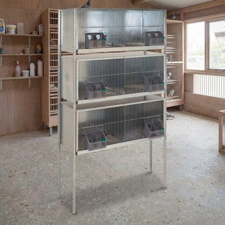 Gaiola para pombos com seis compartimentos. Bandeja removível. Pés de apoio. Piso em tela para facilitar a limpeza. Divisória dobrável com opção de união dos dois compartimentos. Fabricada em latão. *Consulte diretamente a disponibilidade de rodízios para este produto.