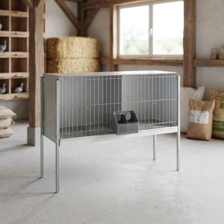 Gaiola para pombos com dois compartimentos. Bandeja removível. Pés inclusos. Piso em tela para facilitar a limpeza. Laterais e divisórias em chapa metálica. Fabricada em chapa galvanizada. Dimensões: 104 x 45 x 76 cm. Encosto disponível em arame ou chapa galvanizada.