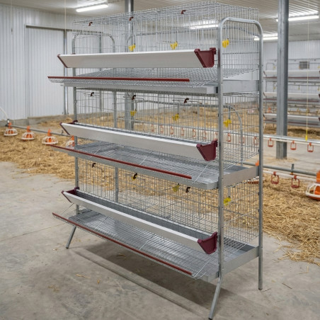 Gaiolas para galinhas poedeiras estilo Califórnia em baias coletivas para 4 galinhas por seção, equipadas com comedouros e bebedouros em chapa galvanizada. Inclui: Protetor anti-desperdício no comedouro. Comedouro em chapa lacada. Protetor na bandeja de ovos. Separador de ovos por compartimento. Fabricado em tela galvanizada de alta qualidade. Esta gaiola se caracteriza pela facilidade de montagem, pois é fabricada semi-montada. Ganchos e tampas laterais de plástico no comedouro facilitam a remoção da gaiola e a limpeza posterior. Suportes para pernas fáceis de instalar. Não são necessários parafusos; basta colocar os suportes onde as pernas serão inseridas. Capacidade para 45 galinhas. Dimensões: 154 x 70 x 185 cm.