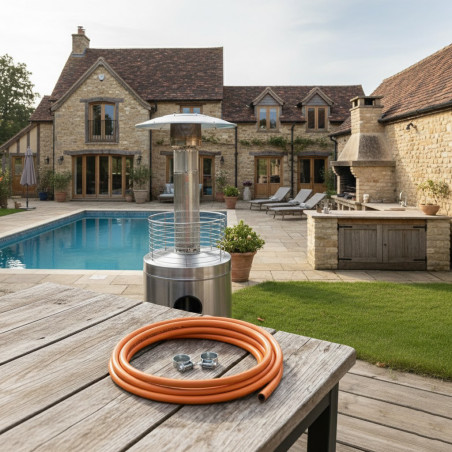 Mangueira de gás butano e propano de 1,5 metro, ideal para fogões e fogões a gás. Inclui braçadeiras para uma instalação rápida e segura. Vazão de 2,5 kg/h e pressão de alimentação de 0,6 a 16 bar. Compatível com GLP/GLP.