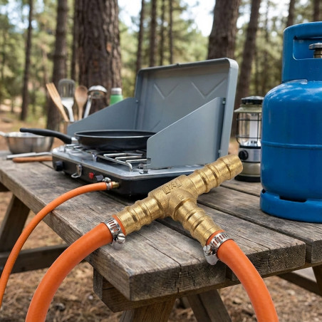 Conector em T para gás butano e propano. 9 mm de diâmetro. Fabricado em latão. Recomenda-se fixar a mangueira com uma braçadeira. Também utilizado para instalações hidráulicas. Pacote com 5 unidades.