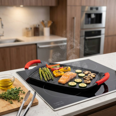 Placa de indução com revestimento de pedra de 47 cm. Antiaderente. Alta qualidade. Livre de PFOA. O alumínio fundido de alta qualidade proporciona maior durabilidade em comparação com as placas tradicionais. Alças duplas de silicone. Alta qualidade. Cozinha saudável e ecológica. Design inovador. Adequada para todos os tipos de placas: vitrocerâmica, gás, elétrica, halogéneo, indução, etc. Dimensões: 47 x 29 cm. Marca: Suinga.