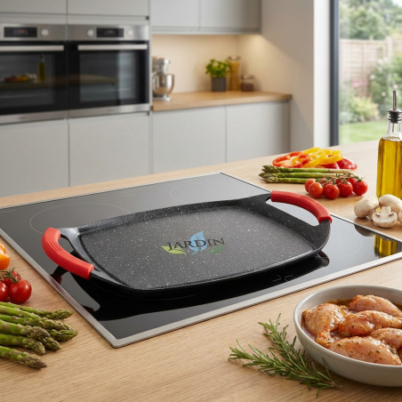 Placa de indução com revestimento de pedra de 47 cm. Antiaderente. Alta qualidade. Livre de PFOA. O alumínio fundido de alta qualidade proporciona maior durabilidade em comparação com as placas tradicionais. Alças duplas de silicone. Alta qualidade. Cozinha saudável e ecológica. Design inovador. Adequada para todos os tipos de placas: vitrocerâmica, gás, elétrica, halogéneo, indução, etc. Dimensões: 47 x 29 cm. Marca: Suinga.