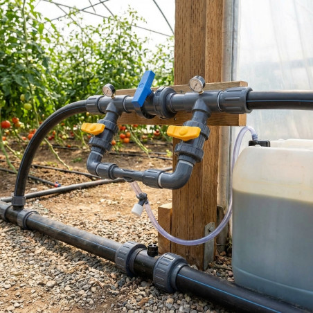 Injetor de fertilizante, 50 mm de diâmetro, com válvulas. Vazão máxima de irrigação: 588 l/h e fertilizante: 40 litros a 3 bar de pressão.
