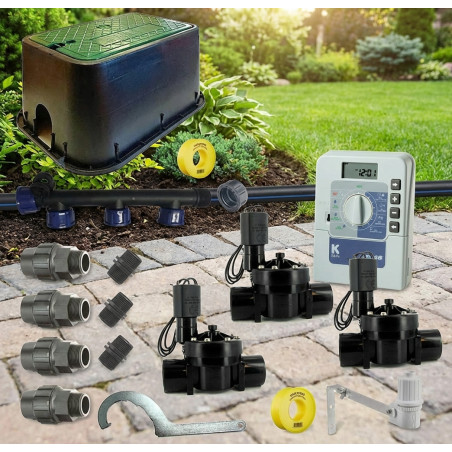 Com o controlador de água interno KRain RPS46 de 4 zonas incluído neste kit, você pode programar o sistema de irrigação do seu jardim de forma automática e fácil.