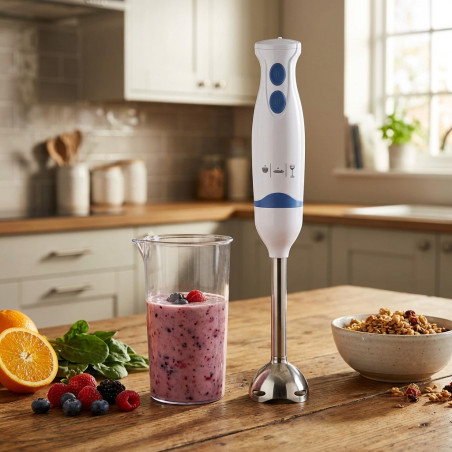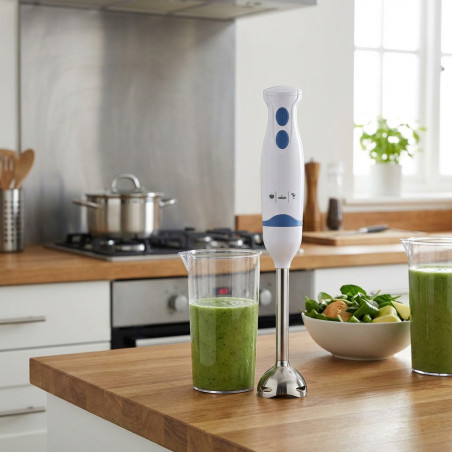 Liquidificador de mão, 2 velocidades, 400W de potência. Este liquidificador de mão oferece duas velocidades com função turbo. Suas lâminas de aço inoxidável o tornam um aparelho durável. Funciona com baixo nível de ruído. A base é removível para facilitar a limpeza e o uso. Inclui um copo medidor de 600ml.