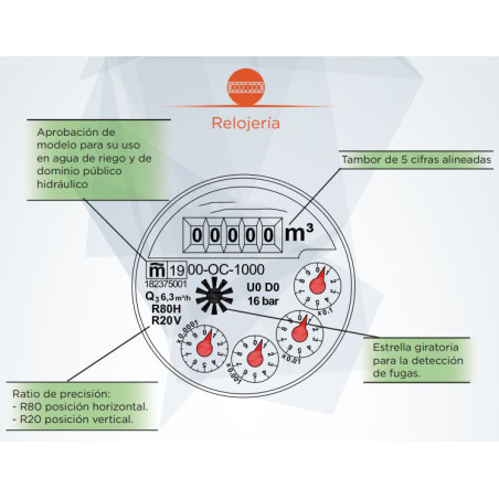 Leitura direta em contador de rolo de 5 dígitos indicando m³.