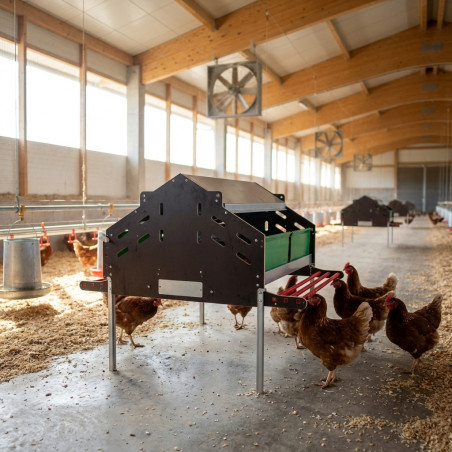 Aproximadamente 120 galinhas podem usar esta caixa de nidificação coletivamente.