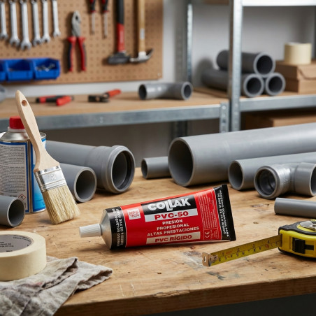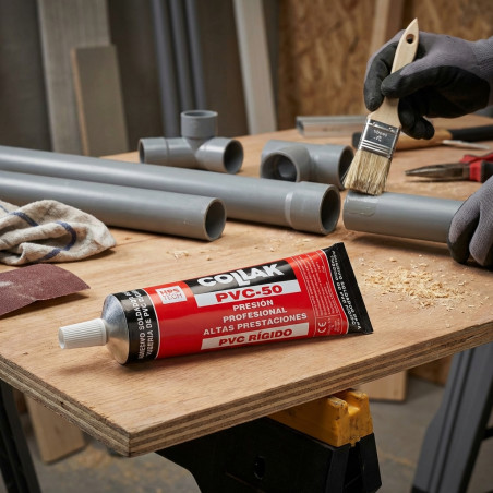 Este adesivo de fácil aplicação proporciona ligações fortes e resistentes que suportam produtos agressivos e o envelhecimento. Está em conformidade com as normas UNE-EN 14814 e UNE-UN 14680. É um adesivo de soldagem para unir tubos e materiais rígidos de PVC, particularmente adequado para sistemas pressurizados. Limpe e desengordure as superfícies a serem unidas. Aplique uma camada fina e uniforme de adesivo na luva e, em seguida, uma camada mais espessa na extremidade chanfrada do tubo. Faça a junção imediatamente, sem torcer. Remova o excesso de adesivo com um pano. A junção não deve ser submetida a tensão ou movimento durante os primeiros 10 minutos. Dependendo da temperatura ambiente e da ventilação da junção, o adesivo endurecerá aproximadamente 4 horas após a aplicação. Em instalações que devem suportar pressões superiores a 1,5 atm, aguarde pelo menos 24 horas antes de colocá-las em serviço. A resistência da ligação é estimada até a ruptura do material, não até a ruptura da junção. Este produto é INFLAMÁVEL. Portanto, deve-se garantir boa ventilação no local de trabalho e evitar todas as fontes de faíscas ou fogo. Para obter mais informações, consulte a Ficha de Dados de Segurança.
