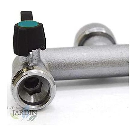 Torneira de jardim em latão com 3 saídas, ideal para uso externo e em jardins.