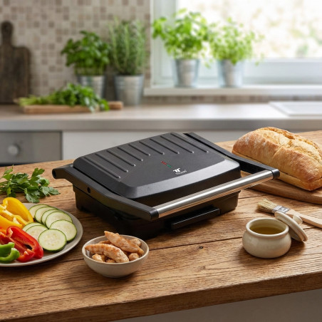 Descubra a versatilidade e a rapidez na sua cozinha com a nossa Sanduicheira e Grelha Panini de 1000W. Concebida para os amantes da gastronomia e para quem valoriza a praticidade, esta grelha elétrica multifuncional é a sua parceira perfeita para preparar desde deliciosos sanduíches e paninis a carnes, legumes e muito mais. O seu potente elemento de aquecimento de 1000W garante um aquecimento rápido e uniforme, permitindo-lhe desfrutar das suas refeições favoritas em apenas alguns minutos.