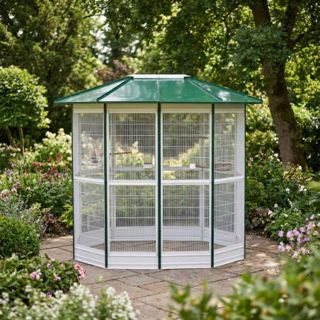 Viveiro de alta qualidade para papagaios e pássaros. Design com 14 lados e dimensões totais de 232 x 255 cm. Telhado verde. Fabricado na Espanha.