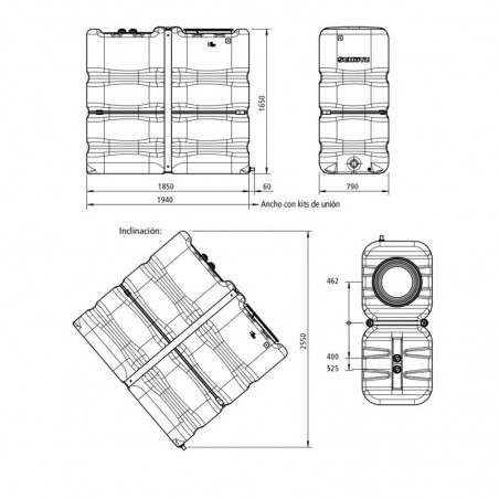 Réservoir en polyéthylène haute densité avec protection anti-UV. Convient pour l'eau potable, les produits alimentaires et autres liquides. Longueur 185 cm, Largeur 79 cm, Hauteur 165 cm. Fabriqué en polyéthylène. Convient pour un usage alimentaire. Opaque. Écologique : 100% recyclable. Comprend un adaptateur pour filetage de type gaz. Filetage de sortie 2''. Couvercle supérieur DN 560. Possibilité d'installer un trop-plein et une bouée avec flotteur.