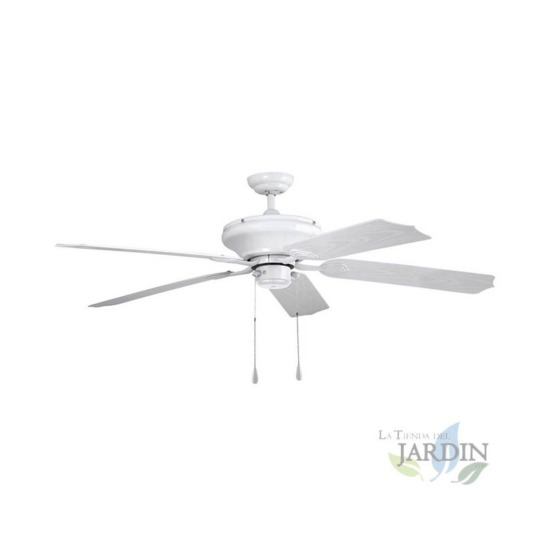 Ventilador de teto externo branco Orbegozo , ideal para uso interno e externo. Possui 5 pás de PVC e proteção IP-23. Possui 3 velocidades de ventilação e um sistema reversível para os modos inverno e verão. Possui 132 cm de diâmetro, 60 W de potência e 37 cm de altura.